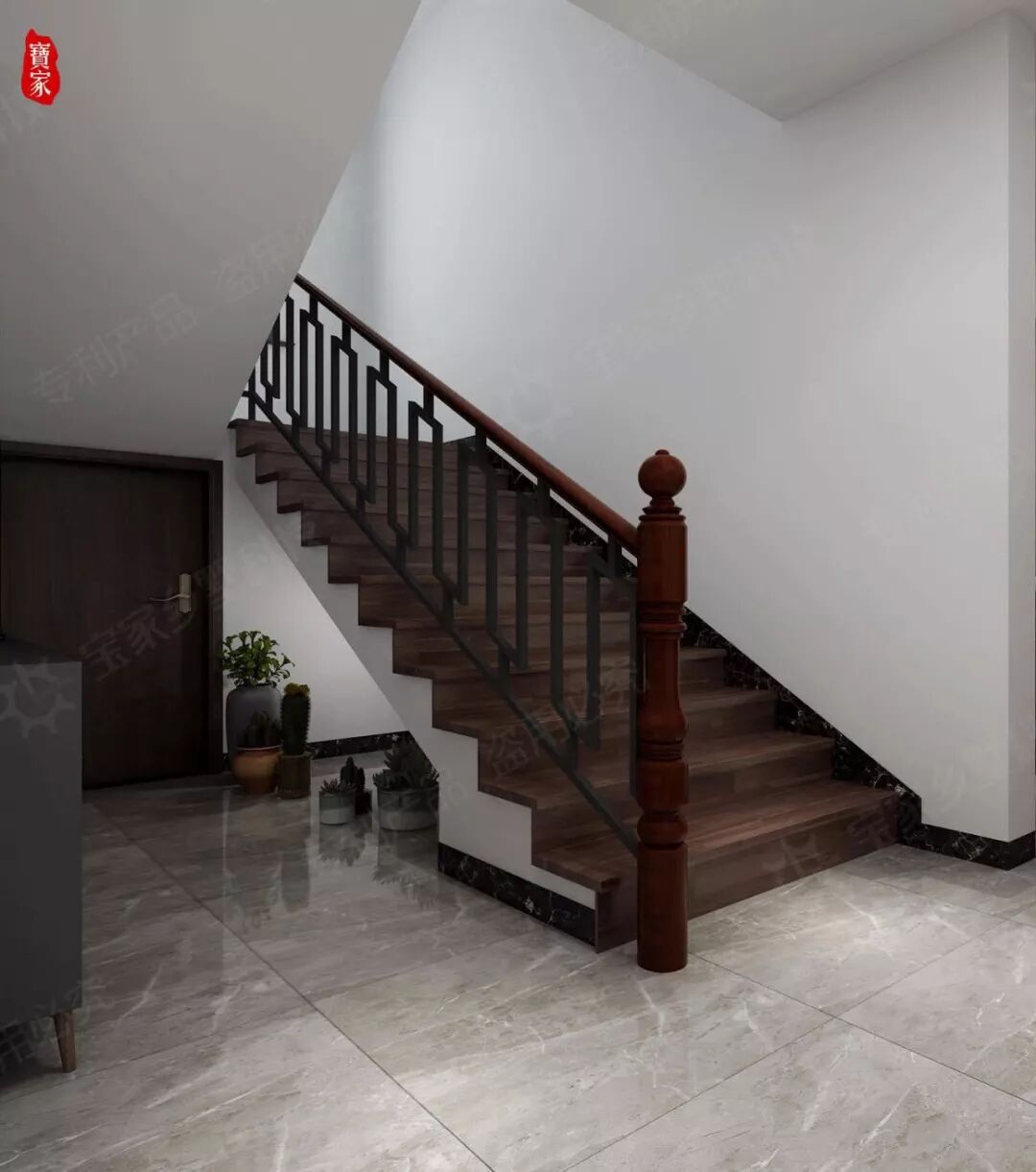 除了配置楼梯扶手,宝家还将踏步高度定为15公分(一般室内是16-18公分),楼梯的坡度为30°(最舒适),缓而安全的楼梯设计,老人也可轻松上楼。